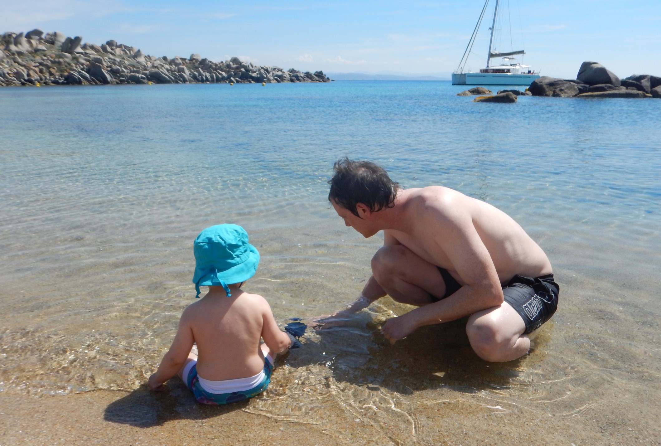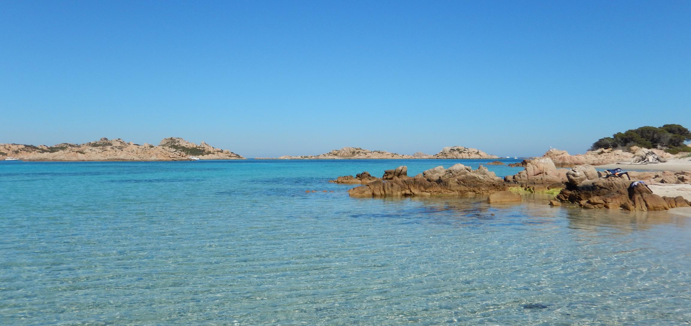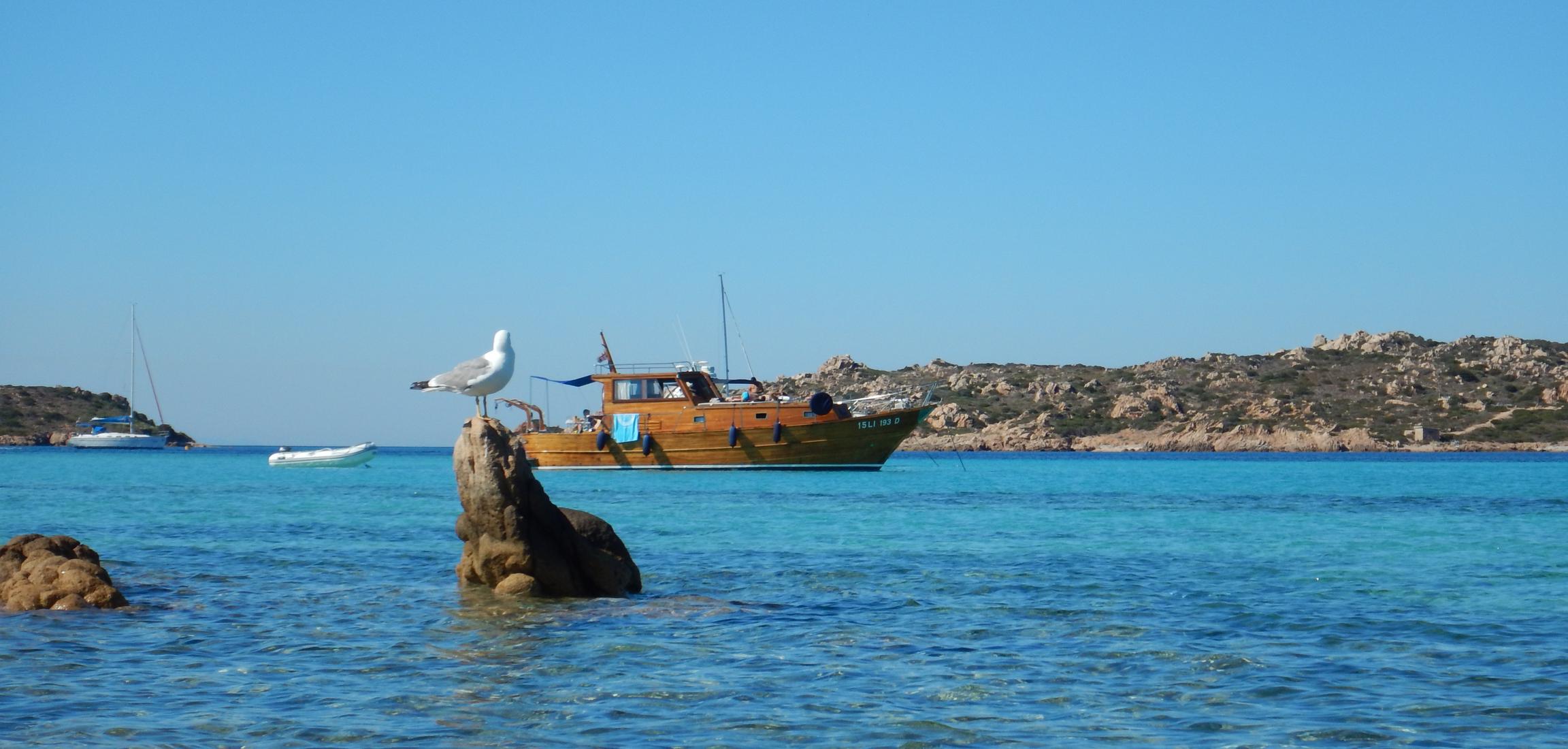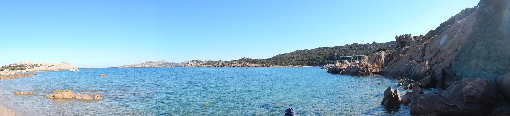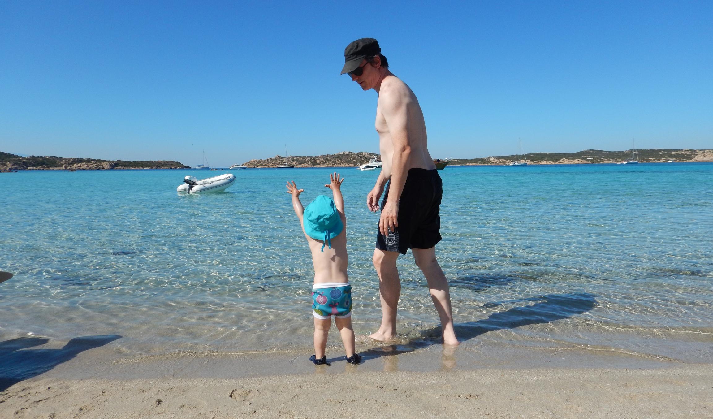 Der Wind bläst gemütlich aus NE, wir nutzen das, um ein bisschen herumzusegeln. Das Maddalena-Archipel ist, jetzt wo wir uns um die Tagesplanung kümmern, irgendwie kleiner als wir uns das vorgestellt haben. Wir starten mit der Umrundung der Insel Caprera. Diese Insel gehörte einmal dem in Italien allgegenwärtigen Giuseppe Garibaldi, einem der Protagonisten der italienischen Einigungsbewegung, der auch international gerne mal an der einen oder anderen Revolution beteiligt war (und dabei wohl auch ganz gut verdiente). Er hat sich eine schöne Insel ausgesucht. In die Cala Cotticio (klein Tahiti, laut unserem Revierführer) schauen wir nur kurz hinein und segeln dann doch weiter. Sie sieht zwar traumhaft aus, aber es ankern dort bereits dutzende Stinkpotter, und der kleine Strand scheint auch schon gut gefüllt. Der Wind soll in dieser Nacht auch weiter aus Norden kommen, daher scheidet die anvisierte Cala Garibaldi aus und wir wollen uns an eine der Bojen in Porto Massimo legen. Wir finden zwischen den etlichen schwimmenden Dieselfressern noch eine freie Boje. Prompt kommt ein Schlauchi angerauscht. Wir mögen die Boje bitte freilassen, da noch ein Boot für sein Restaurant kommt, aber der Hafen sei gratis. Im Revierführer ist diese Marina mit der höchsten möglichen Preisklasse angegeben. Zum quietschenden Vergnügen der kleinen Matrosin machen wir als einziges Boot in der verlassenen Marina neben einer Barge mit einem Bagger fest. "BaggaBagga!". Der Hafen ist privat betrieben und gehört zu dem Hotel, welches es sich scheinbar leisten kann, nur von Juni bis Mitte September Betrieb zu haben. Auch gut, denken wir uns, und begeben uns an den feinen Hotelstrand. Die Stinkpotter haben inzwischen allesamt die "Restaurantbojen" verlassen und die Bucht gehört uns. Leider auch die ca. 100 Stechmücken, von denen wir nur gut die Hälfte in die ewigen Sumpfgründe schicken können.