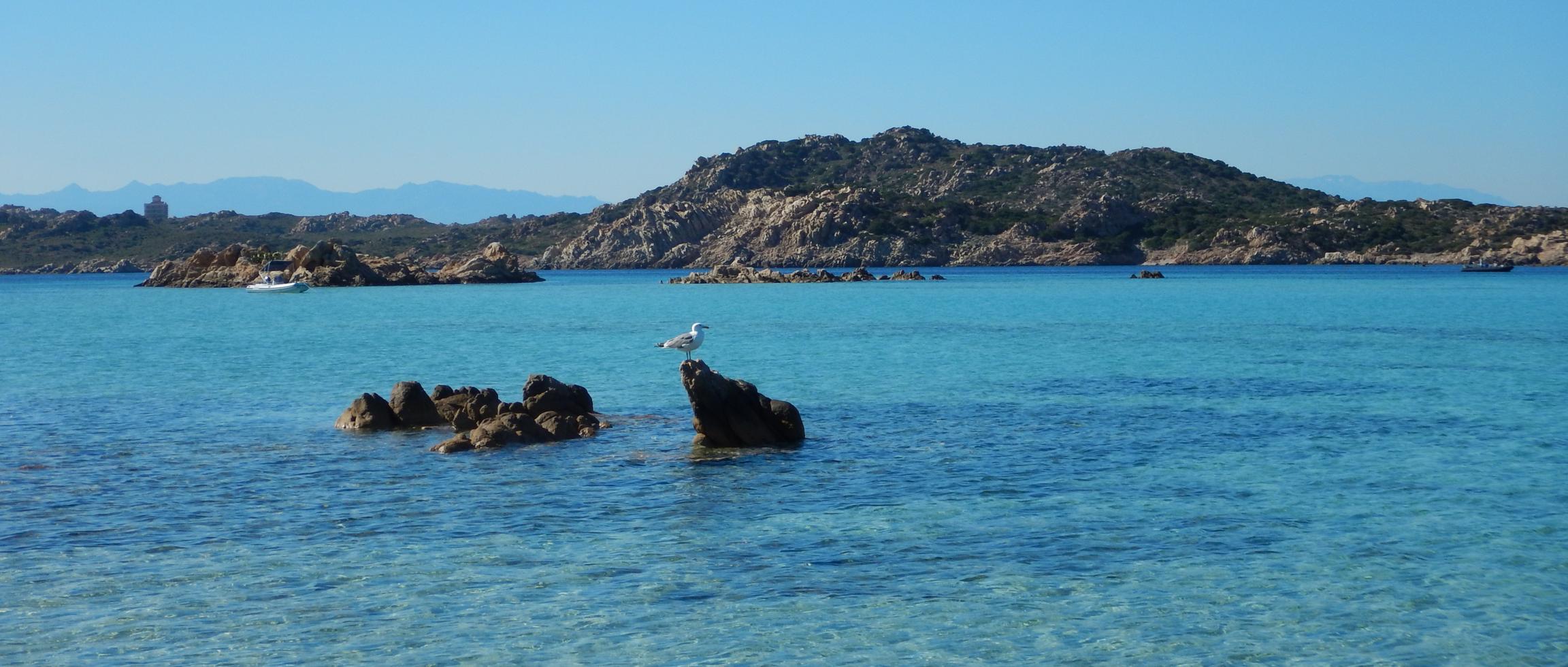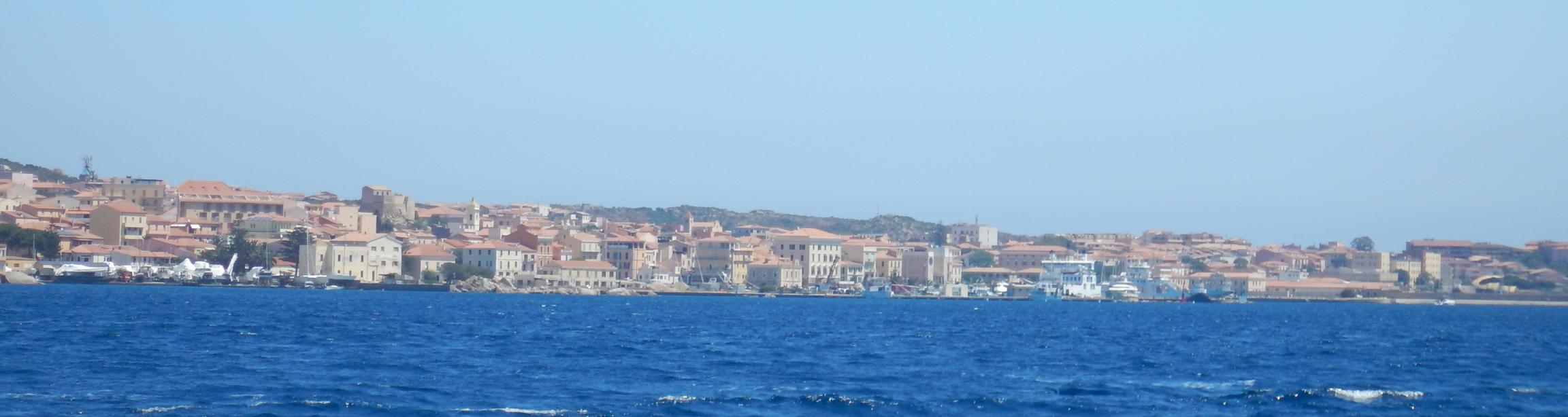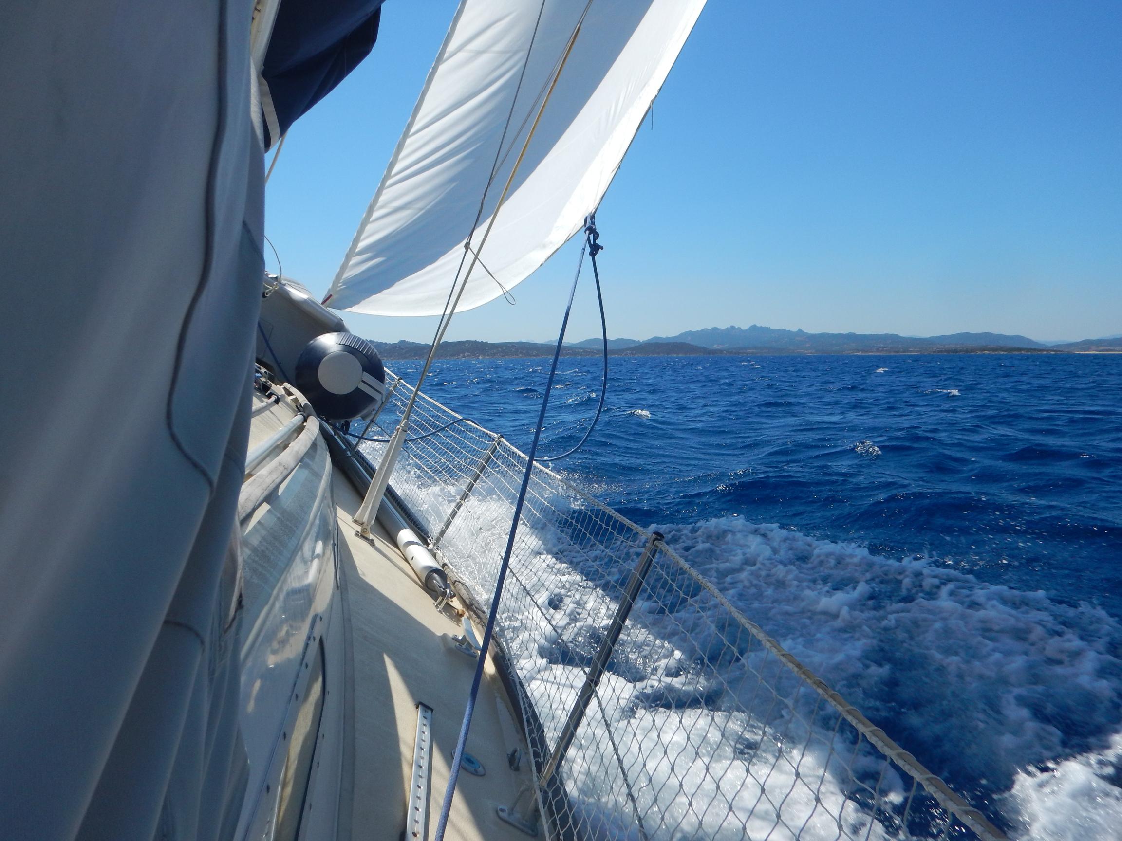 Pünktlich bevor die ersten Ausflugsschiffe eintreffen, machen wir von der Lavezzi-Boje los und segeln wieder Richtung Italien. Über die Straße von Bonifacio geht es auf Halbwindkurs im ersten Reff gut dahin und bald erreichen wir das Maddalena-Archipel. Wir hissen wieder die italienische Flagge.