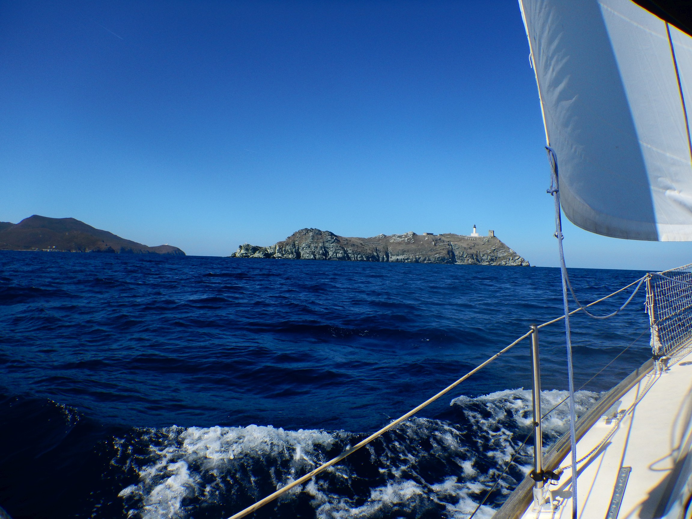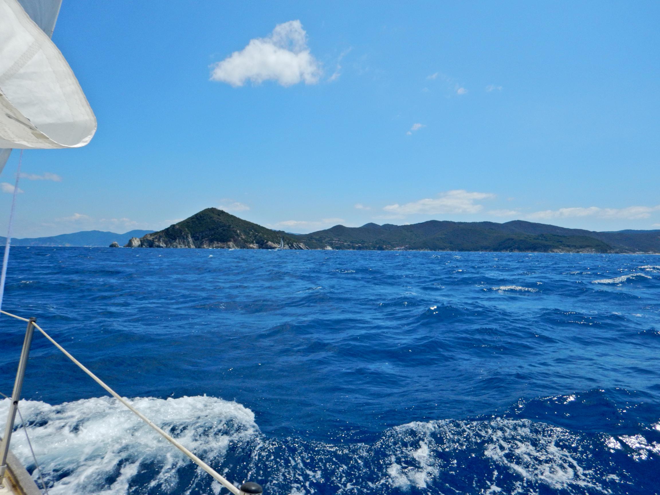 Drei Tage später verlassen wir Elba Richtung Korsika. Die Großwetterlage kündigt Mistral und generell viel Wind für Freitag/Samstag an. Das würde bedeuten, dass wir erst am Sonntag aufbrechen könnten, wenn wir nicht noch die Wellen davon abbekommen wollen. Man muss das jüngste Crewmitglied ja nicht unnötig wild schaukeln lassen. Auch diesmal schiebt uns raumer Wind und zeitweise unser zuverlässiger alter Schwede, zügig an unser Ziel. In der Distanz sehen wir die kleine Insel Montecristo hoch aufragen, den Mindestabstand von einer Meile zum komplett flachen Inselchen Pianosa halten wir penibel ein. Die "Naturschutz" Sperrzone dort ist mit hohen Mauern und unzähligen Wachtürmen bewehrt. Sicher der militante Arm von Greenpeace oder so.