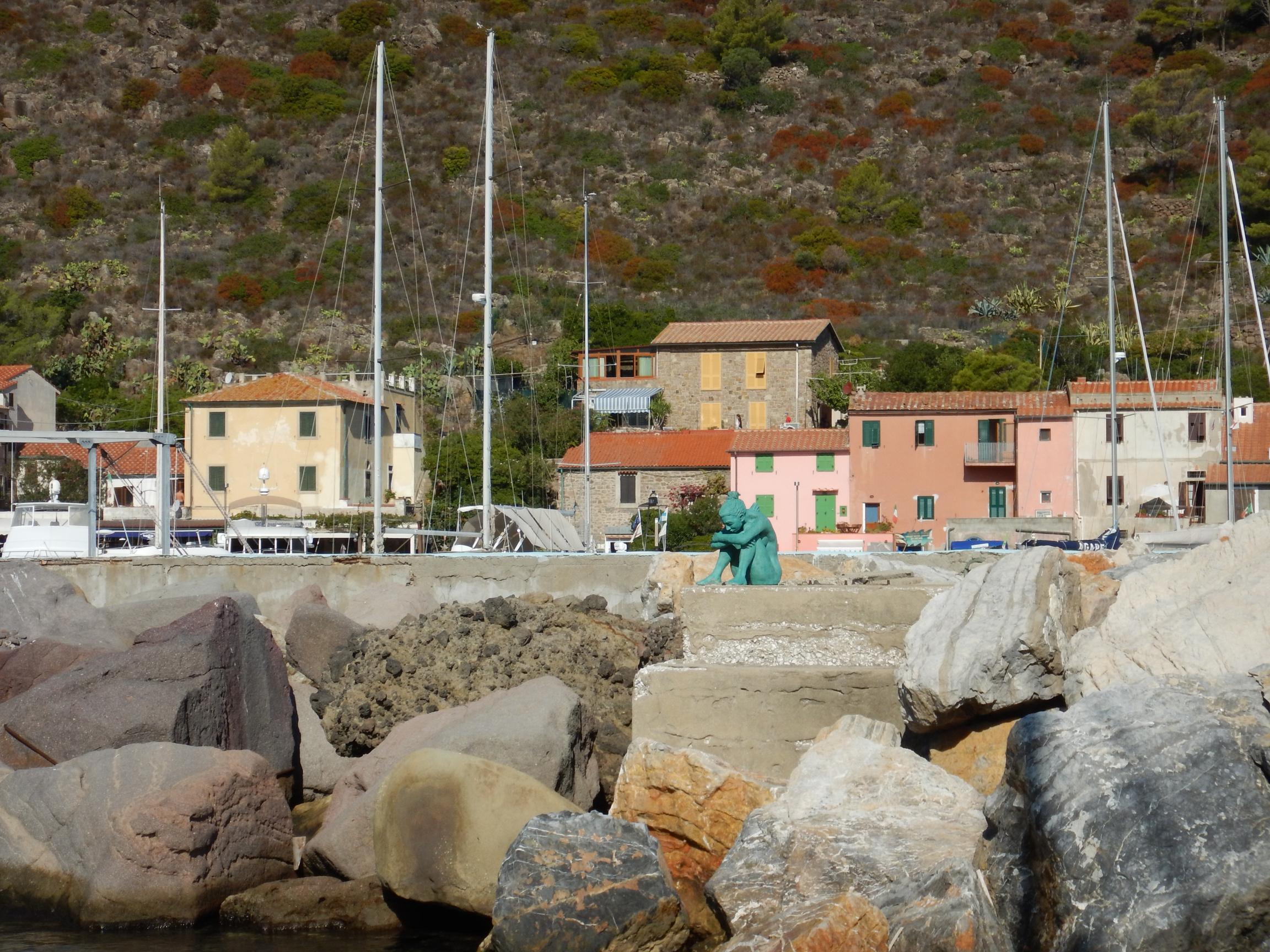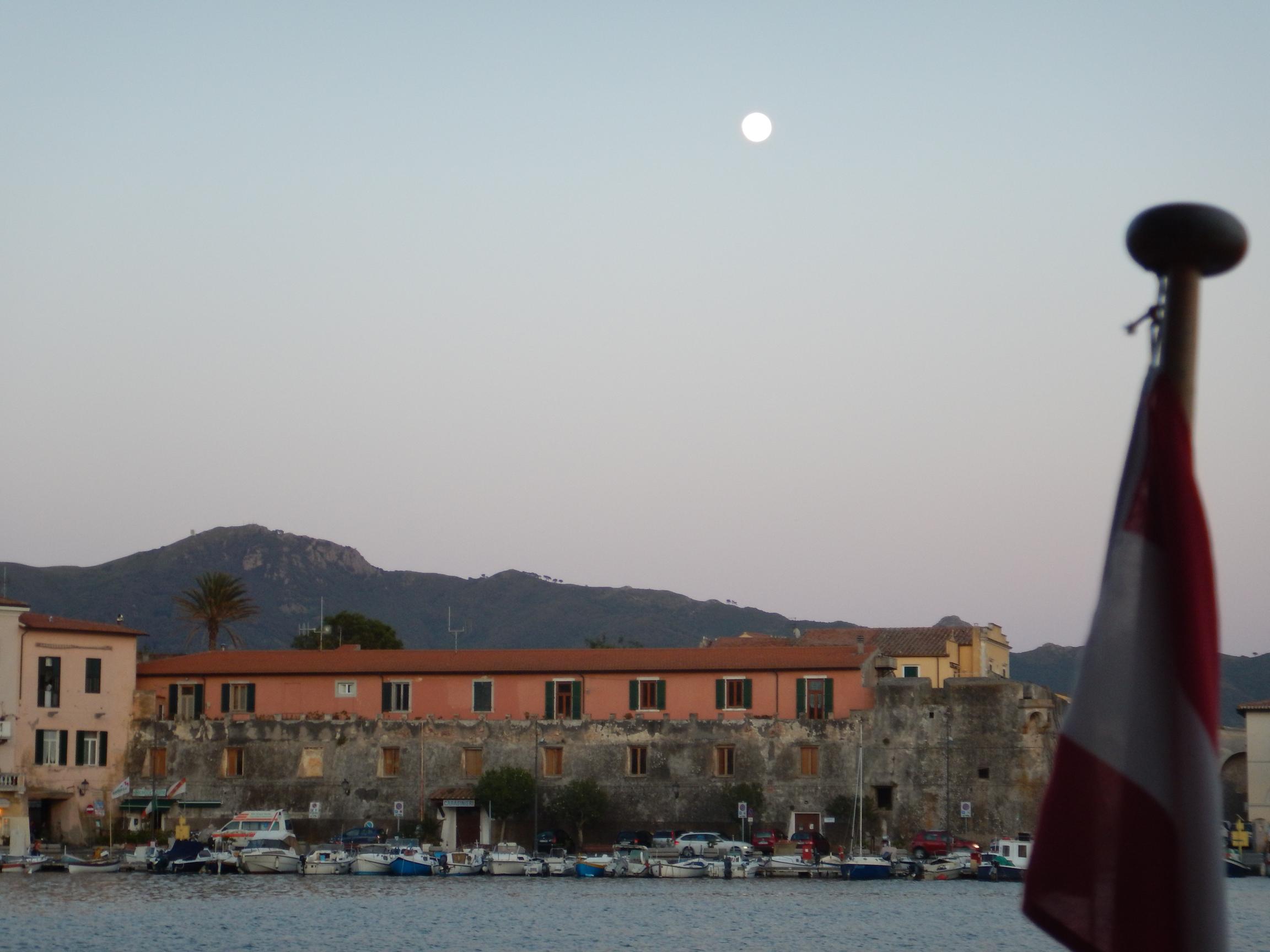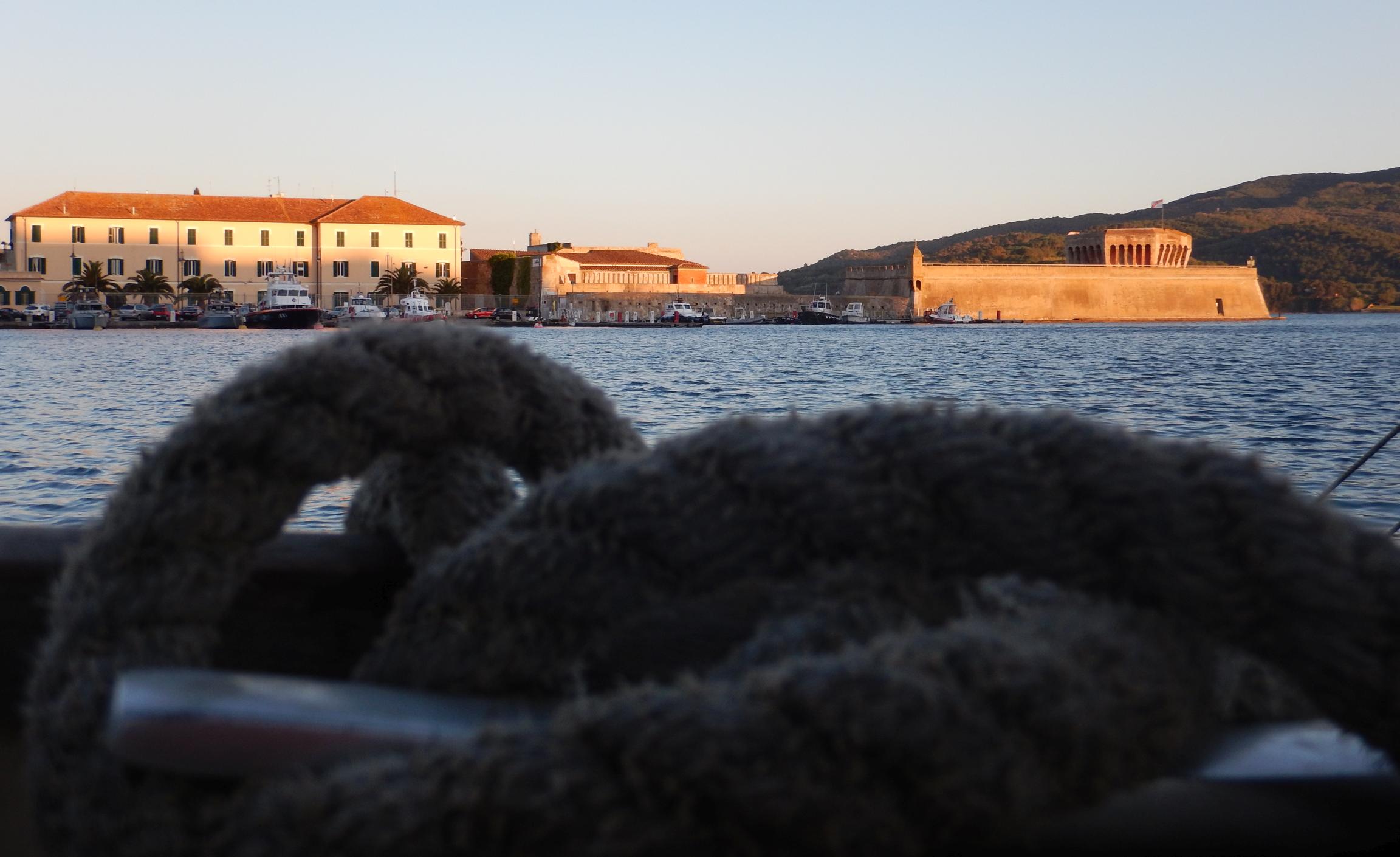 Unser erstes Etappenziel ist Capraia, eine schroffe Insel, die bis in die 80er Jahre eine Strafkolonie und bald danach ein Naturschutzgebiet wurde. Etwa 45 Seemeilen bei leichtem Wind. So ereignislos, dass wir noch unterwegs unseren bis jetzt noch unbenutzten Aussenborder instandsetzen können. Der alte Yamaha 2-Takter springt entgegen unserer Erwartungen mit etwas Startspray gleich mal an. Noch vor Sonnenuntergang kommen wir im Hafen des einzigen Ortes auf der Insel an.